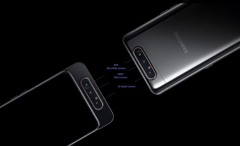 Galaxy A80, как и предполагалось, получил тройную камеру с необычным выезжающим и вращающимся механизмом. Благодаря такой конструкции, камера смартфона выступает в роли основной и фронтальной. Она состоит из главного 48-Мп датчика с диафрагмой f/2.0, широкоугольного объектива на 8 Мп с углом охвата 123 градуса и сенсора глубины 3D ToF.
