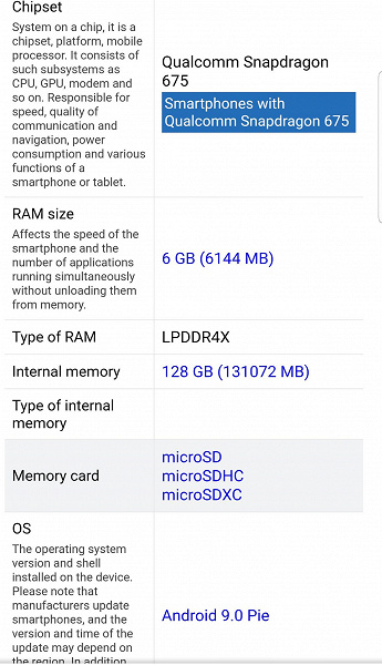 В плане технических характеристик смартфон предложит однокристальную платформу Qualcomm Snapdragon 675, 6 ГБ ОЗУ LPDDR4X, 128 ГБ флэш-памяти, слот для карт microSD, предустановленную операционную систему Android 9.0 Pie, аккумулятор емкостью 3500 мАч, порт USB-C и 3.5-мм аудиоразъем.
