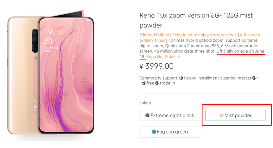 В настоящее время новый Oppo Reno 10x Zoom доступен для предварительного заказа в Китае. Поставки устройств начнутся с 18 июня. Модель Mist Pink доступна в двух моделях — 6 ГБ ОЗУ + 128 ГБ ПЗУ за 3999 юаней (~ $578) и 8 ГБ ОЗУ + 256 ГБ ПЗУ за 4799 юаней (~ $693).