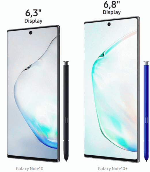 Galaxy Note10+ оборудован 6.8-дюймовым изогнутым Dynamic AMOLED Infinity-O дисплеем с разрешением Quad HD+ (3040 х 1440 пикселей), плотностью 498ppi, HDR10+, защитным стеклом Corning Gorilla Glass 6. Смартфон выпускается в версиях с 12 ГБ ОЗУ и 256/512 ГБ памяти UFS 3.0. Питание осуществляет аккумулятор емкостью 4300 мАч с поддержкой быстрой проводной зарядки мощностью до 45 Вт и беспроводной зарядки (WPC и PMA), Wireless PowerShare. Кроме того, Galaxy Note10+ получит версии с поддержкой 5G. У обычного Note10 тоже будет поддержка сетей пятого поколения, но стоимость его 5G-версий не озвучена. В наличии слот для карт памяти объемом до 1 ТБ, только он гибридный.