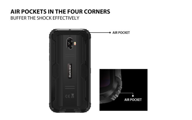 Blackview BV5900 предлагает покупателям очень прочный корпус, который не боится падений на твердые поверхности с высоты 1.5 метра. Углы прорезинены и имеют специальные воздушные карманы. Устройство соответствует требованиям американского военного стандарта MIL-STD-810G, а также степени защиты IP69K, поэтому смартфон может выдержать высокотемпературную мойку под воздействием высокого давления воды.