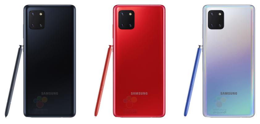 На просторы интернета попало несколько качественных рендеров Galaxy Note10 Lite, на которых смартфон продемонстрирован в цветовых вариантах Aura Black, Aura Glow и Aura Red.