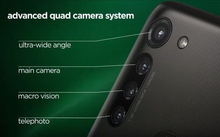 На задней панели есть массив с четырьмя камерами, включающий 16-Мп основной датчик, 8-Мп сверширокоугольный с углом обзора 118 градусов, 8-Мп телеобъектив с 2-кратным оптическим зумом и 2-Мп макрообъектив. Сканер отпечатков пальцев снова находится в круглом углублении логотипа Moto.
