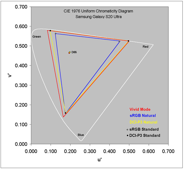 Панель Dynamic AMOLED 2X в Galaxy S20 Ultra установила рекорды в точности режимов экрана sRGB и DCI-P3, по абсолютной точности цветопередачи, точности шкалы контрастности и интенсивности.