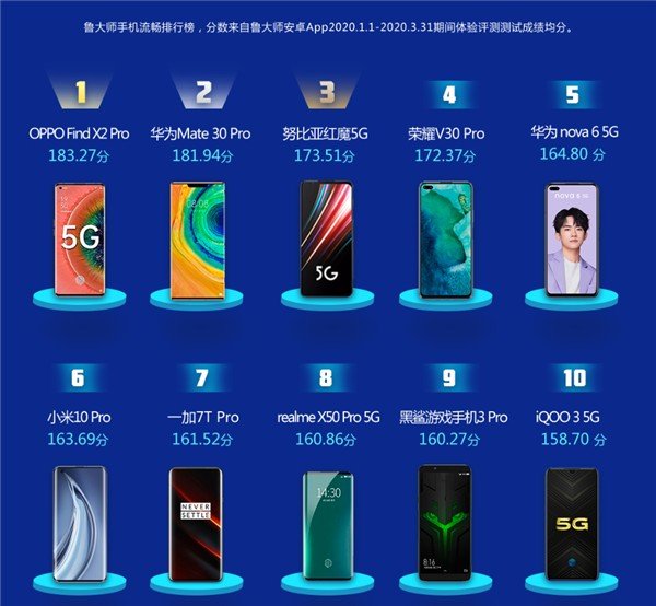Кроме того, в десятке лучших оказались смартфоны Samsung Galaxy S20+, Xiaomi Mi 10 Pro, Realme X50 Pro, Vivo Nex 3S, Iqoo 3 5G, Samsung Galaxy S20 Ultra и Redmi K30 Pro.