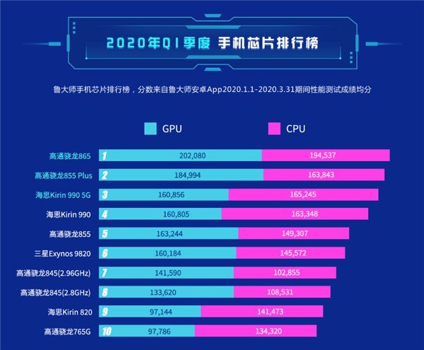 Если смотреть на чипы, которыми оснащены самые производительные смартфоны квартала, то на первом месте идет Snapdragon 865, далее — Snapdragon 855 Plus, ну и замыкает тройку Kirin 990 5G.