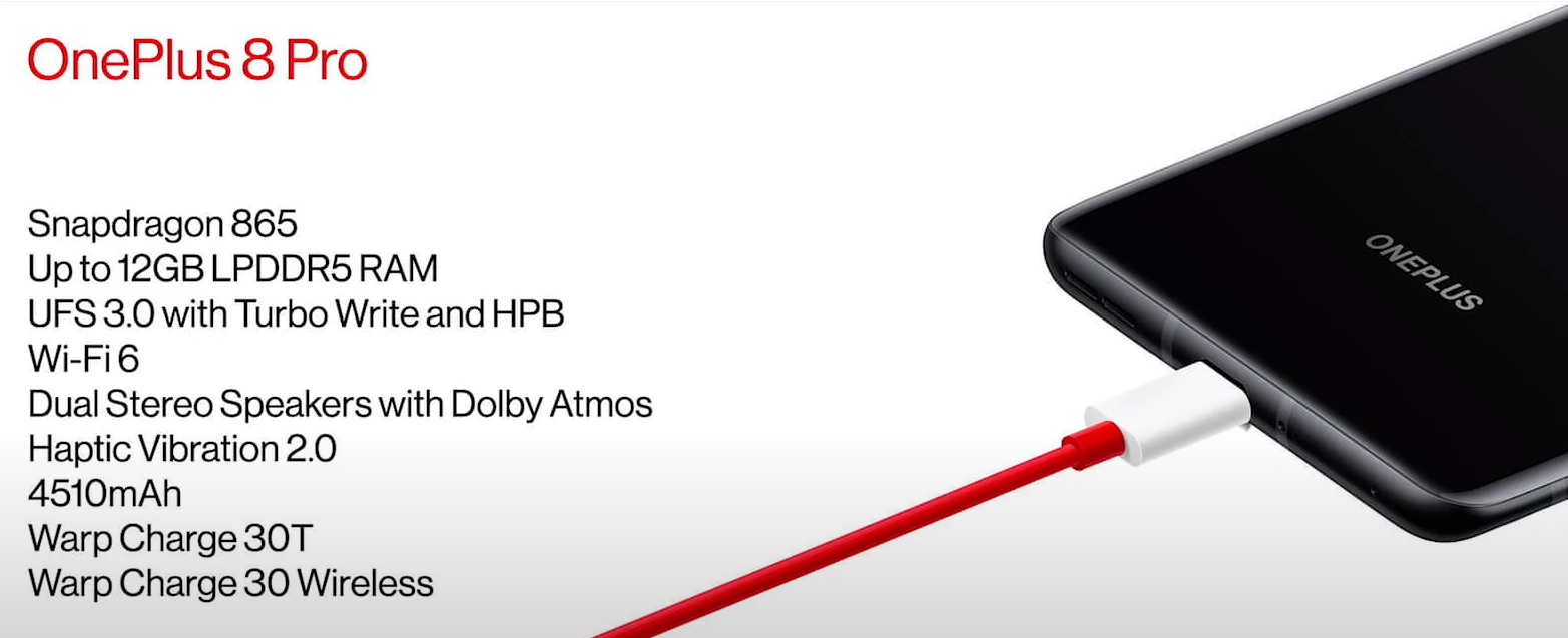 Питание OnePlus 8 Pro осуществляет аккумулятор ёмкостью 4510 мАч с поддержкой быстрой зарядки Warp Charge 30 Wireless на 30 Вт и беспроводной зарядки. От 3% до 55% смартфон заряжается за полчаса. В наличии Wi-Fi 6, Bluetooth 5.1, 5G SA/NSA и порт USB 3.1. Габариты составили 165.3 х 74.3 х 8.5 мм при весе 199 г. Управляет устройством операционная система Android 10 с прошивкой OxygenOS 10.0 с Dark Mode 2.0.