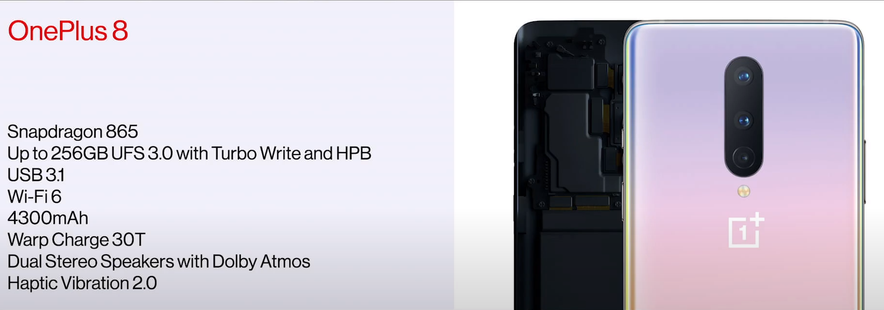 Обычный OnePlus 8 также имеет чип Snapdragon 865, получил 8 ГБ или 12 ГБ ОЗУ типа LPDDR4X, 128 ГБ или 256 ГБ флэш-памяти типа UFS 3.0, аккумулятор ёмкостью 4300 мАч с поддержкой быстрой зарядки Warp Charge 30T на 30 Вт. Управляет устройством операционная система Android 10 с прошивкой OxygenOS 10.0 с Dark Mode 2.0.
