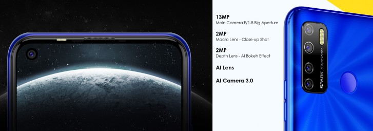 Смартфон получил 8-ядерный процессор MediaTek, 2 ГБ оперативной памяти, 32 ГБ флэш-памяти, слот для карт microSD, основную квадрокамеру с главным 13-Мп датчиком, сканер отпечатков пальцев на тыльной панели, поддержку 4G, аккумулятор на 5000 мАч, 3.5-мм аудиоразъем, предустановленную ОС Android 10 с пользовательским интерфейсом Tecno HiOS 6.1.