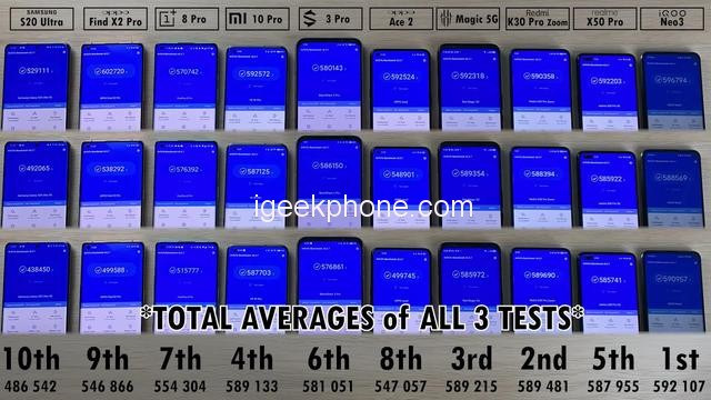 В итоге первое место занял iQOO Neo 3, второе — Redmi K30Pro, третье — Red Magic 5G, четвертое — Xiaomi 10Pro, пятое — Realme X50 Pro, шестое — Black Shark 3 Pro, седьмое — OnePlus 8 Pro, восьмое — Oppo ACE 2, девятое — Find X2 Pro и десятое — Samsung Galaxy S20 Ultra.