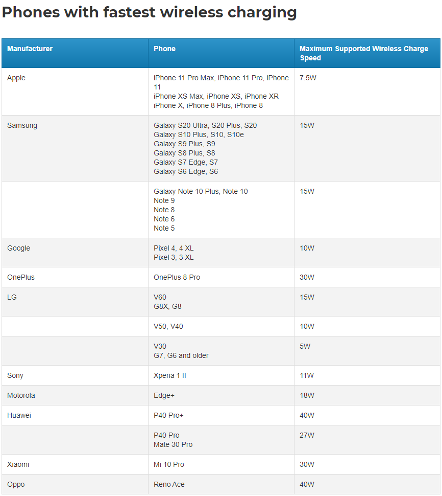 Samsung Galaxy S20 Ultra, S20 Plus, S20 Galaxy S10 Plus, S10, S10e Galaxy S9 Plus, S9 Galaxy S8 Plus, S8 Galaxy S7 Edge, S7 Galaxy S6 Edge, S6, LG V60 G8X, G8 поддерживают 15-Вт зарядку, а Motorola Edge — 18-Вт.