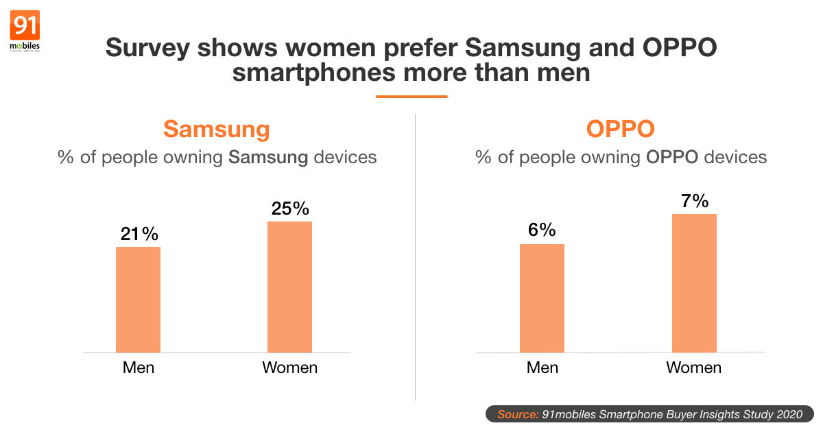 Согласно проведенным исследованиям, большинство смартфонов Xiaomi и Realme приобретают мужчины, а женщины отдают свое предпочтение телефонам Samsung и Oppo.