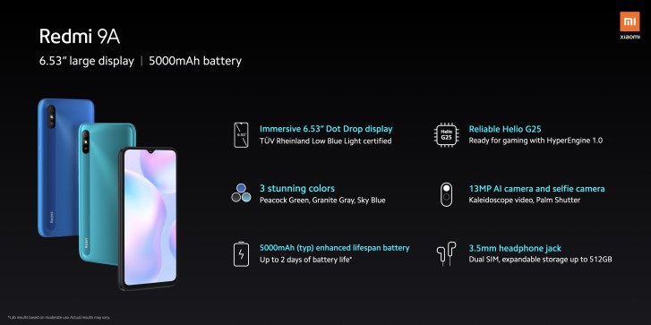 Redmi 9A будет доступен для покупки в сером, зеленом и синем цветах.