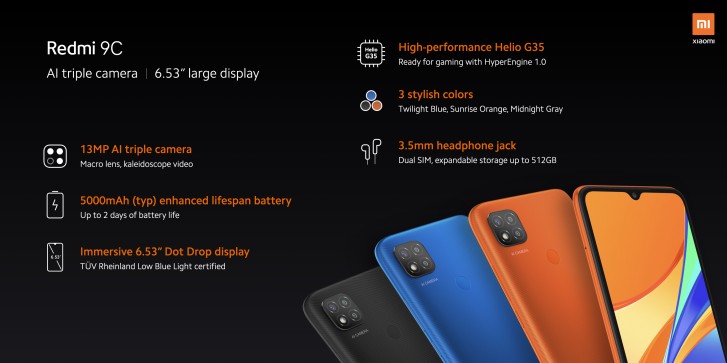 Redmi 9C также питается от батареи емкостью 5000 мАч с зарядкой от microUSB порта и управляется Android 10 с оболочкой MIUI 12. Варианты цвета — серый, оранжевый и синий.