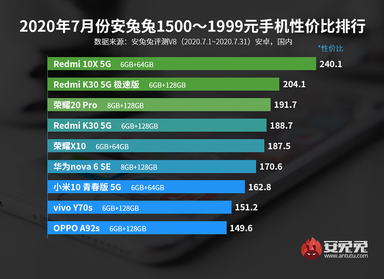 В категории от 1500 до 1999 юаней (от $215 до $287) также находится смартфон Redmi — Redmi 10X 5G. После него мы видим Redmi K30 5G, Honor 20 Pro, Redmi K30 5G, Honor X10, Huawei Nova 6 SE, Xiaomi Mi Youth Edition 5G, Vivo Y70s и Oppo A92s.