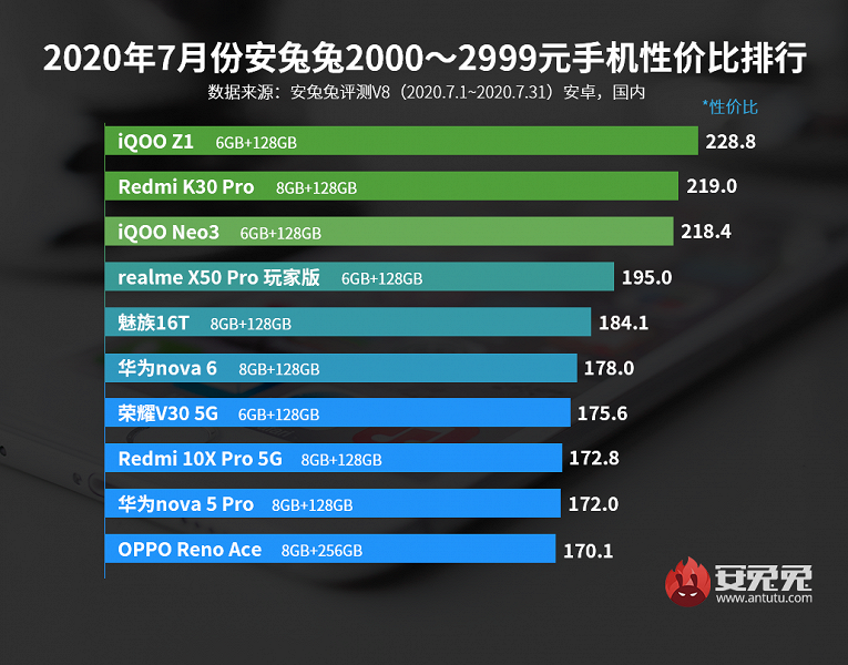 iQOO Z1 стал лучшим в категории от 2000 до 2999 юаней (от $287 до $431). Вслед за ним идут Redmi K30 5G (8/128 ГБ), iQOO Neo3, Realme X50 Pro Player Edition, Meizu 16T, Huawei Nova 6, Honor V30 5G, Redmi Note 10X Pro 5G, Huawei Nova 5 Pro и Oppo Reno Ace.