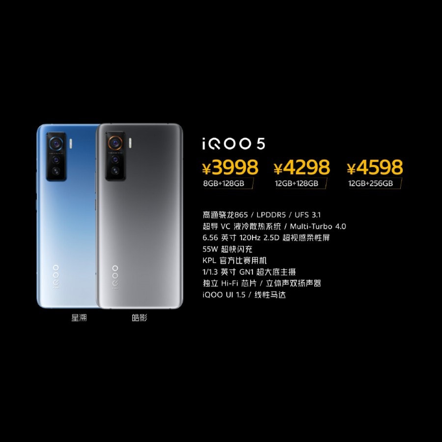 iQOO 5 будет доступен в синем и сером цветах по цене 3998 юаней ($576) за версию c 8/128 ГБ, 4298 юаней ($620) — 12/128 ГБ и 4598 юаней ($662) — 12/256 ГБ.