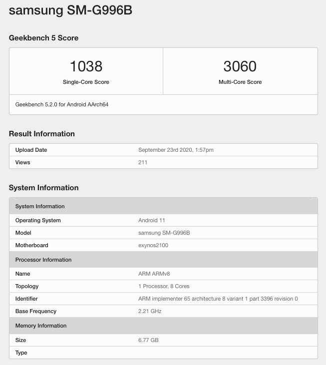 Exynos 2100, как видно, является 8-ядерным: 1 ядро с тактовой частотой 2.91 ГГц, 3 ядра с тактовой частотой 2.81 ГГц и 4 ядра с тактовой частотой 2.21 ГГц. Чип включает в себя графику Mali-G78.