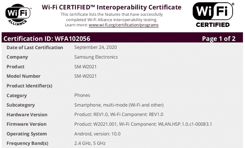 Указанное устройство уже побывало на сертификации регулятора Wi-Fi Alliance, где прошло под номером модели SM-W2021. Видимо, речь идет о преемнике прошлогоднего Samsung W20.