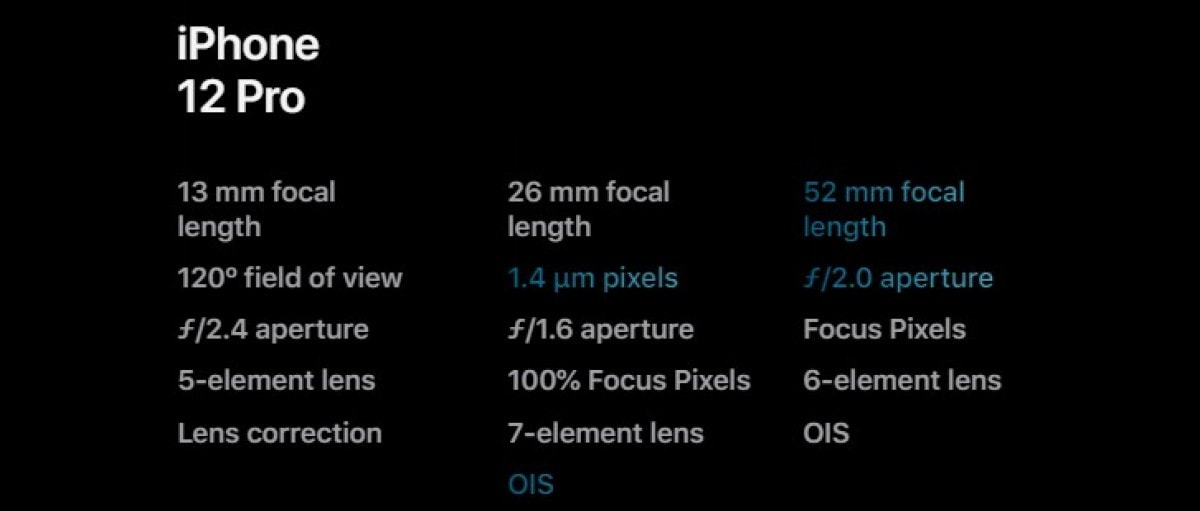 Что касаесят iPhone 12 Pro, то он получил 12-Мп основную камеру с диафрагмой f/1.6, оптической стабилизацией, объективом из 7 линз и фокусным расстоянием 26 мм. Он также имеет 12-Мп телеобъектив с диафрагмой f/2.0, фокусным расстоянием 52 мм (это означает двукратное оптическое увеличение по сравнению с основной камерой) и классической оптической стабилизацией изображения.