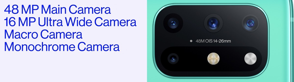 На задней панели смартфона установлен прямоугольный модуль, включающий светодиодную вспышку и четыре камеры — 48-Мп основную с сенсором Sony IMX586 и оптической системой стабилизации изображения, как в модели OnePlus 8, 16-Мп сверхширокоугольную с углом обзора 123°, 5-Мп макрообъектив с фокусным расстоянием до 3 см и 2-Мп датчик глубины. Для съемки селфи предусмотрена 16-Мп фронтальная камера, размещенная в специальном отверстии дисплея.