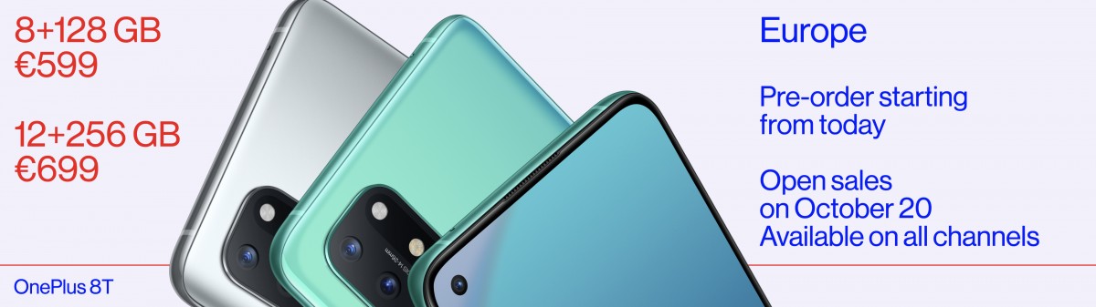 OnePlus 8T будет поставляться в двух цветах: Aquamarine Green и Lunar Silver. Сначала он будет доступен для покупки в Индии по цене $585 за 8/128 ГБ и $630 за 12/256 ГБ. C 20 октября он появится в Европе. Цены будут начинаться от 600 евро за вариант с 8/128 ГБ и 700 евро за модель с 12/256 ГБ. Телефон также будет доступен в Китае и Гонконге.