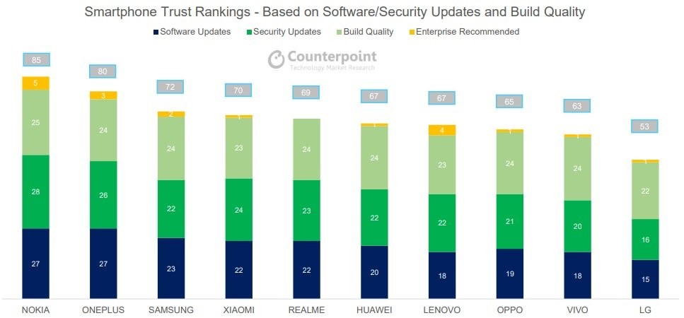 Второй год подряд лидером становится производитель смартфонов Nokia, компания HMD Global. Именно она выпускает комплексные обновления программного обеспечения и обновления для системы безопасности. Кроме того, под брендом Nokia доступна наибольшая линейка устройств, рекомендованных для корпоративного использования.