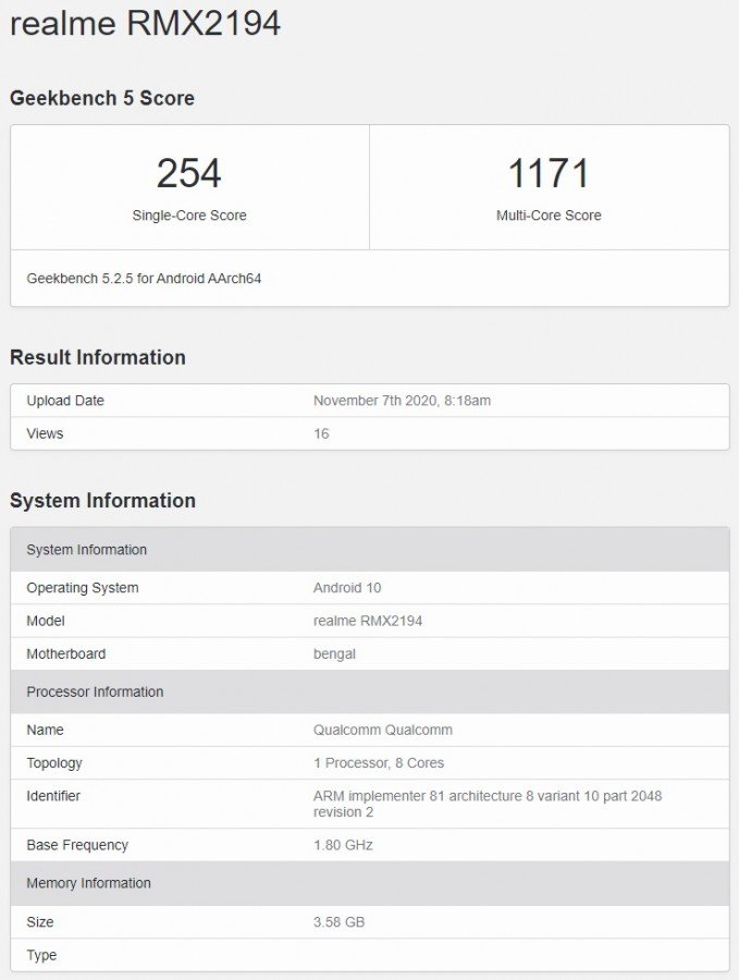 Листинг Realme RMX2194 в Geekbench 5 показывает, что он оснащен восьмиядерным процессором от Qualcomm. Базовая частота составляет 1,80 ГГц, а кодовое имя «bengal» предполагает, что это чипсет Snapdragon 460.