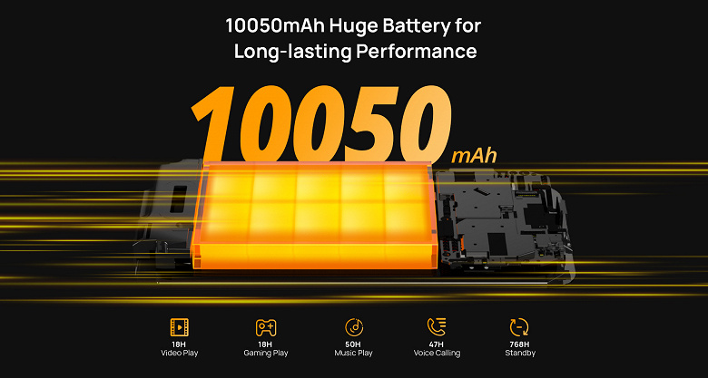 Аккумулятор на 10 050 мАч с зарядкой мощностью 24 Вт должен обеспечить до 32 дней в режиме ожидания, или 2 суток в режиме прослушивания музыки. При обычном использовании смартфон не потребует подзарядки в течение 3-5 дней.