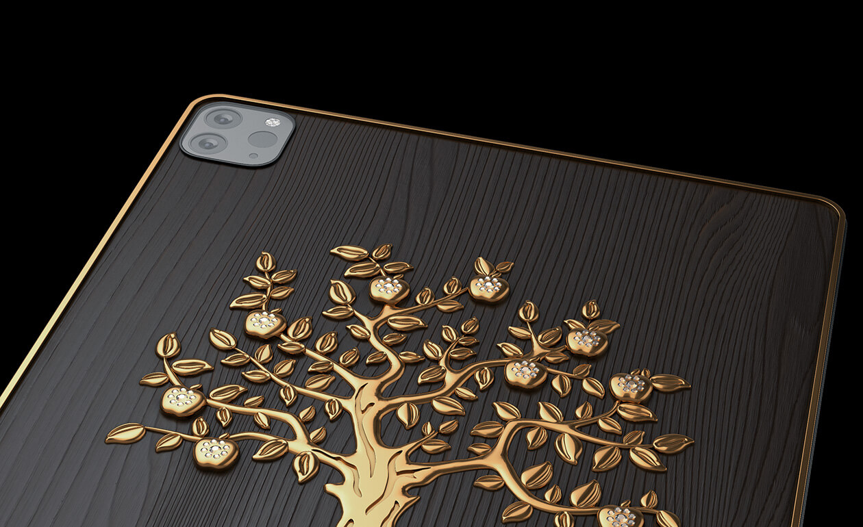 В серию входит планшет iPad Pro Grand Apple. Он будет изготовлен в единственном экземпляре. Его стоимость составит $184 310. Ценник настолько высок из-за того, что яблоня и все что ниже на тыльной панели выполнено из 1 кг 18-каратного золота, яблоки — из 81 бриллианта, верхняя же часть — это натуральное дерево.
