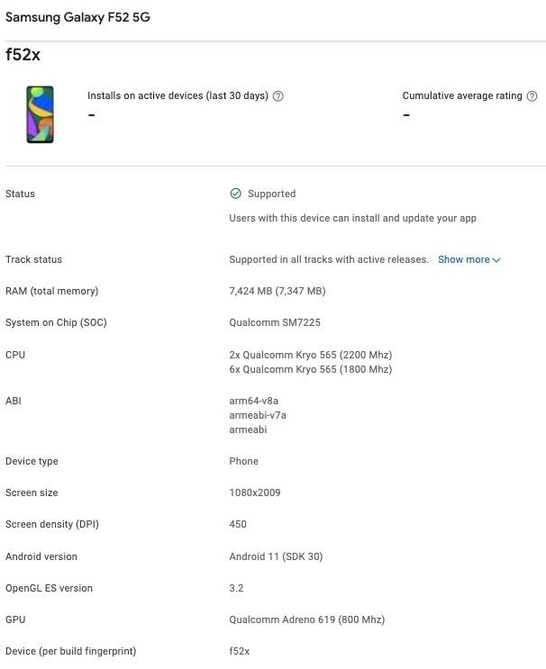 Сейчас известно, что Galaxy F52 5G оснащается 6.52-дюймовым экраном AMOLED с разрешением Full HD+ и плотностью пикселей 450ppi, чипом Snapdragon 750G, 8 ГБ оперативной памяти и ОС Android 11.