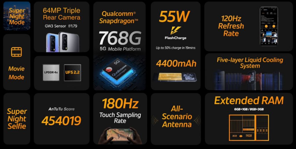 В кнопку включения на правой грани встроен сканер отпечатков пальцев. Устройство оборудовано чипом Snapdragon 765G, 8 ГБ ОЗУ, 128/256 ГБ памяти UFS 2.2, слотом для карт microSD, аккумулятором емкостью 4400 мАч с зарядкой мощностью 55 Вт. До 50% смартфон заряжается за 19 минут.