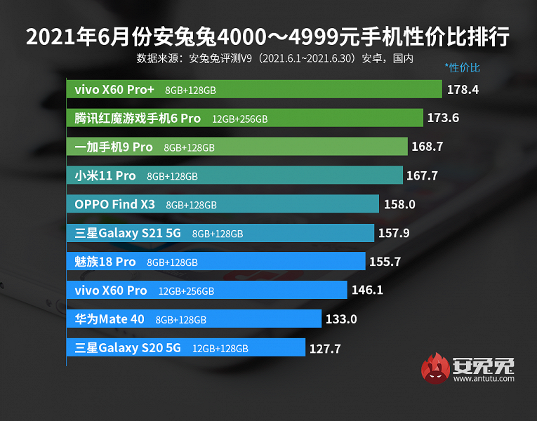В категории от 4000 до 4999 юаней (от $617 до $770) первенство оказалось за Vivo X60 Pro+ с 8/128 ГБ памяти.