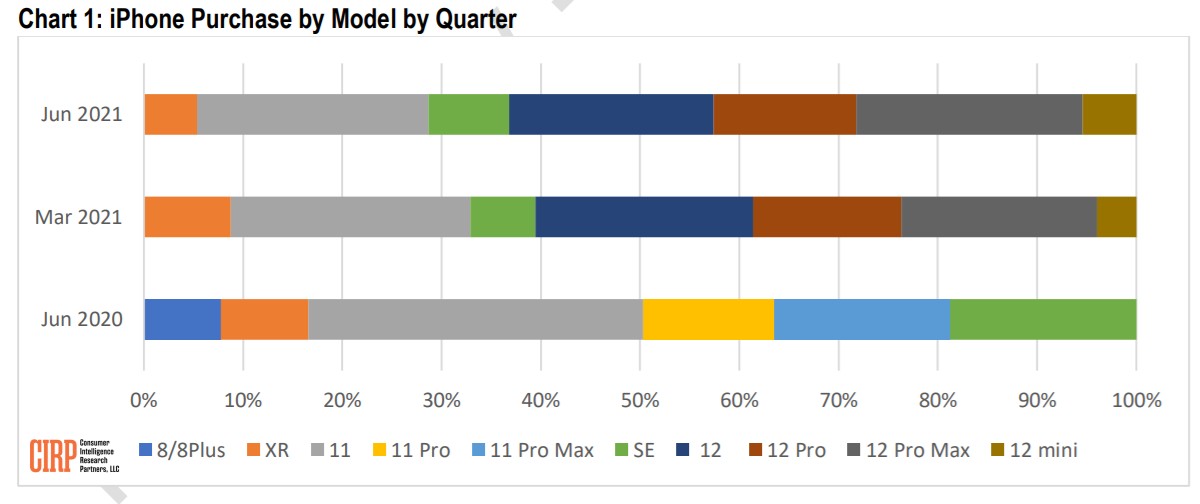 Как видно, во втором квартале первое место по востребованности заняли сразу два смартфона — iPhone 11 и iPhone 12 Pro Max. Оба смогли захватить по 23% рынка.