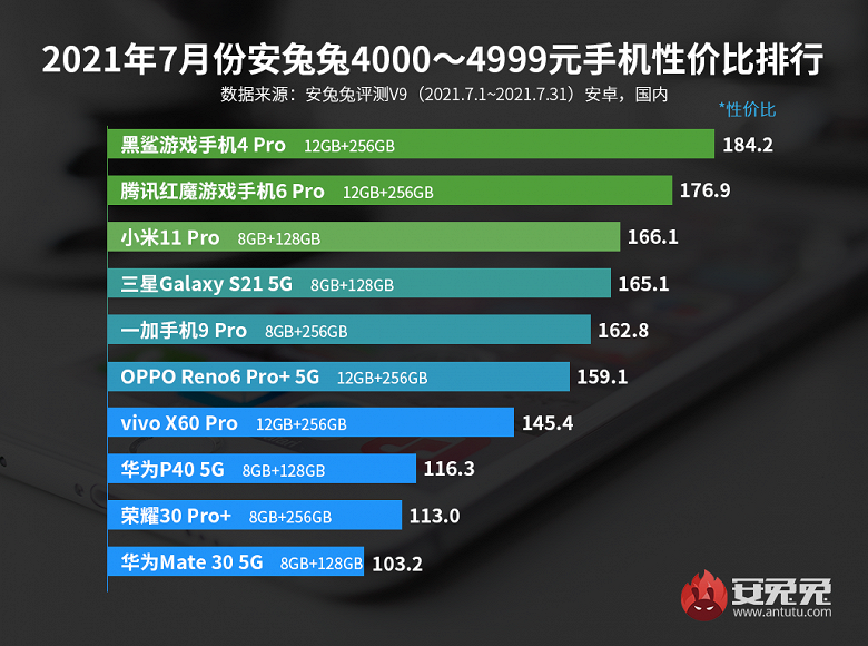 В категории от 4000 до 4999 юаней (от $619 до $772) первое место занял Black Shark 4 Pro с 12 ГБ ОЗУ и 256 ГБ флэш-памяти.
