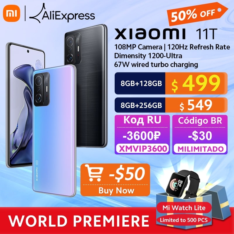 Xiaomi 11T уже доступен для покупки в трех цветах — Meteorite Gray, Moonlight White и Celestial Blue. Его можно купить на AliExpress за $499 — версия с 8/128 ГБ и $549 за модель с 8/256 ГБ. На данный момент можно хорошо сэкономить и получить купон, который дает скидку в $50. Кроме того, для жителей России доступен промокод XMVIP3600, который позволяет сэкономить еще 3600 рублей.