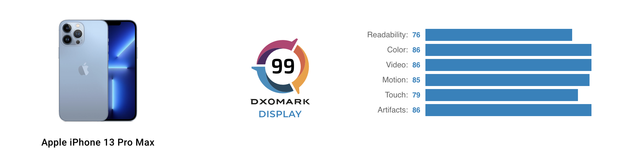 В DxOMark назвали экран iPhone 13 Pro Max «просто великолепным». Из преимуществ матрицы отметили отличную цветопередачу, хорошую читаемость в любых условиях, а также работу HDR10 при воспроизведении видео.