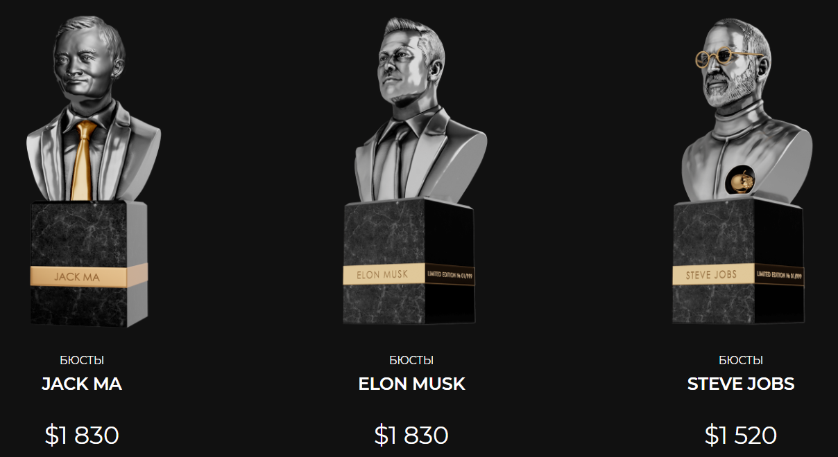 Вместе со специально оформленными смартфонами в коллекцию вошли бюсты перечисленных выше топ-менеджеров. Статуэтки выполнены из ювелирного сплава с серебром, с гранитной или мраморной подставкой и позолоченными элементами. Бюсты Джека Ма и Илона Маска оценены в $1830, а Стива Джобса — в $1520.