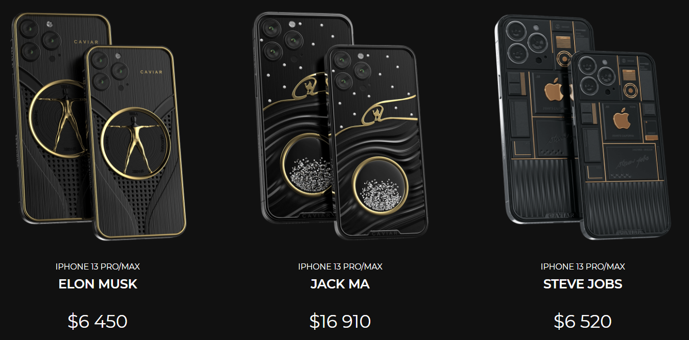 Смартфоны Caviar iPhone 13 Pro Visionaries выполнены в трех вариантах отделки. Версии Elon Musk и Steve Jobs выполнены в титановом корпусе с золотой отделкой и выпускаются тиражом 99 экземпляров каждая по цене $6450 и $6520 соответственно.