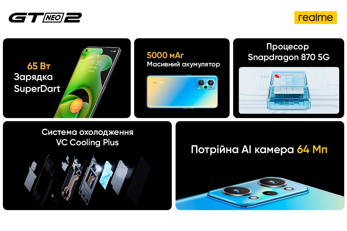 За производительность realme GT Neo 2 отвечает флагманский восьмиядерный процессор Qualcomm Snapdragon 870, созданный по 7-нм технологии. Из плюсов — не настолько горяч как Snapdragon 888, но все же является одним из самых быстрых на рынке. Отлично справляется с тяжелыми играми и задачами с интенсивным использованием графического процессора. Snapdragon 870 потребляет мало энергии и работает достаточно эффективно, когда телефон находится в режиме ожидания.