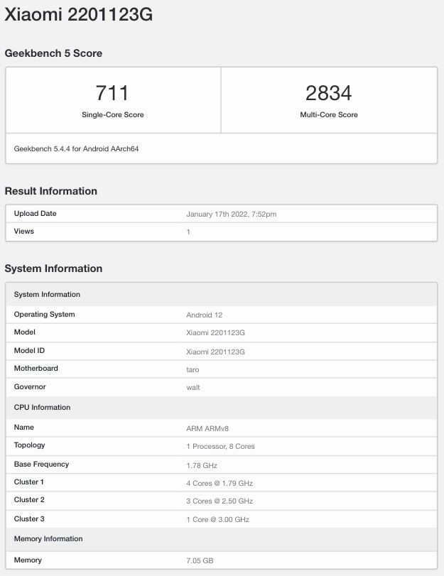 Дело в том, что глобальная версия Xiaomi 12 уже появилась в базе данных популярного тестового приложения Geekbench. Смартфон в ней зарегистрирован под маркировкой Xiaomi 2201123G.