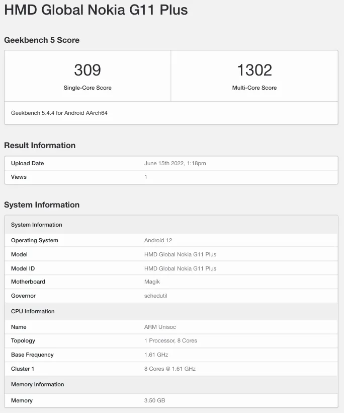 В Geekbench указано, что управляет смартфоном ОС Android 12. Протестированное устройство оснащается 4 ГБ ОЗУ. Nokia G11 Plus набирает в одноядерном тесте бенчмарка 309 баллов, а в многоядерном тесте — 1302 балла.