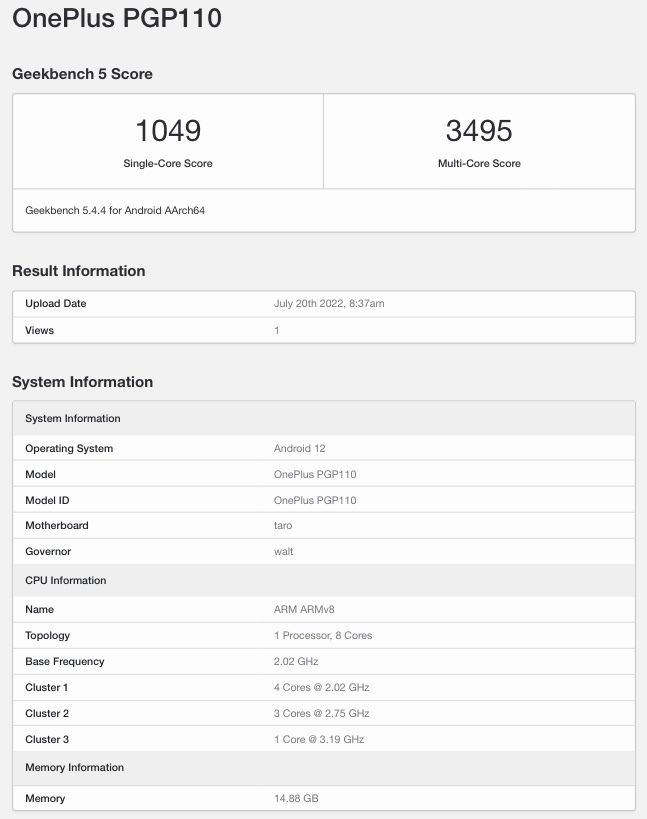 Согласно Geekbench, ожидаемый OnePlus 10T управляется операционной системой Android 12, в его основе лежит однокристальная система Snapdragon 8+ Gen1, а в наличии имеется 16 ГБ оперативной памяти.