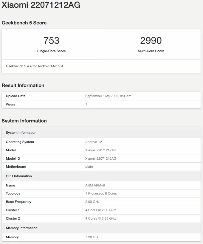 Пока смартфоны не представили, в Geekbench протестировали смартфон под названием Xiaomi 22071212AG, который выйдет на рынок под названием Xiaomi 12T.
