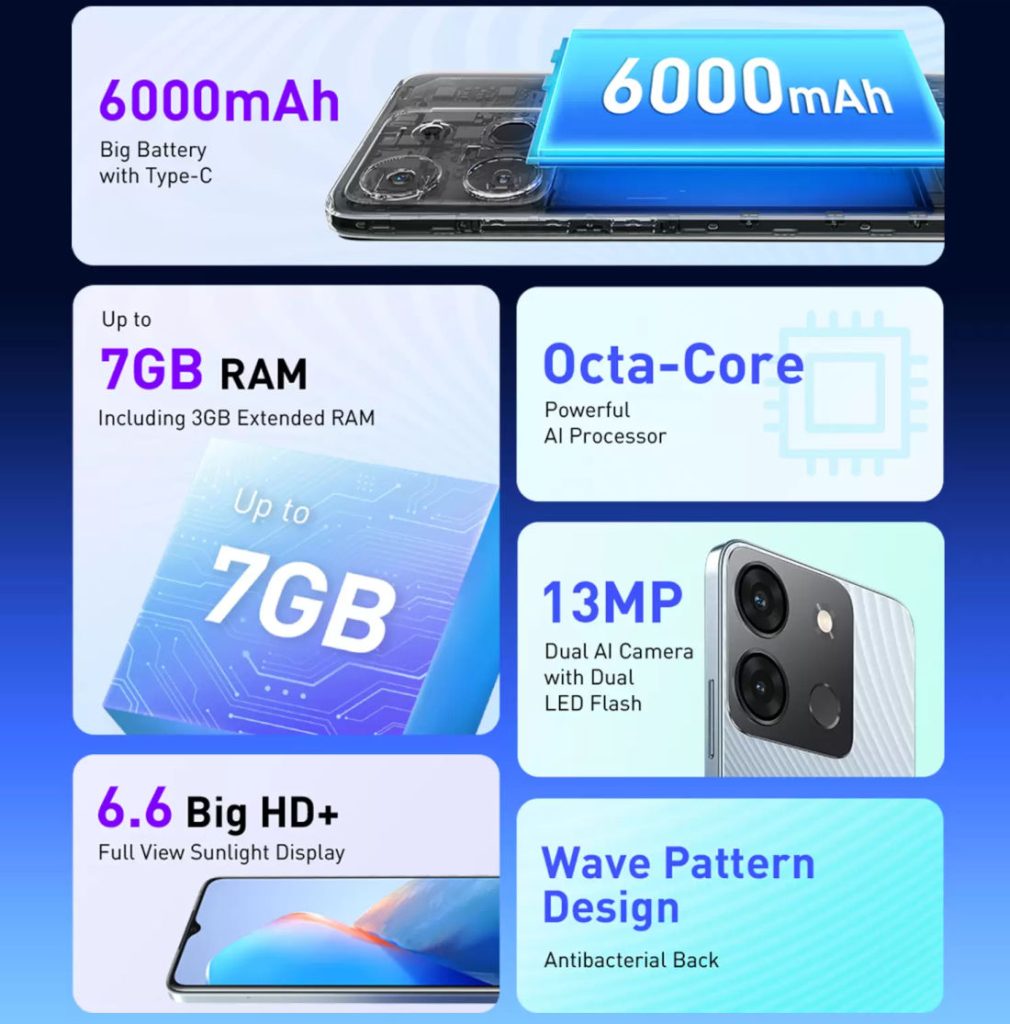 Питает новинку аккумулятор емкостью 6000 мАч, имеется 5-Мп фронтальная камера и основная камера с главным 13-Мп датчиком. Управляет смартфоном прошивка XOS 12 на базе ОС Android 12.