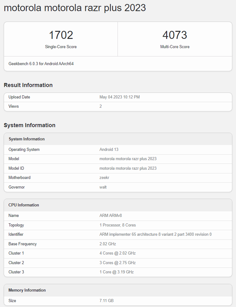 Пока дебют устройства не состоялся, будущий Motorola Razr+ 2023 появился в Geekbench. В одноядерном тесте смартфон набрал 1702 балла, а в многоядерном — 4073 балла.
