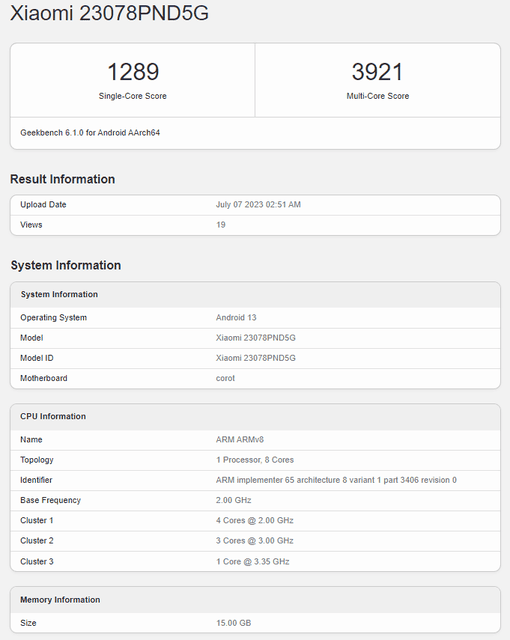 В данном случае использовалась версия смартфона, оснащенная 16 ГБ оперативной памяти. В базе данных бенчмарка указано, что устройство работает под управлением операционной системы Android 13.