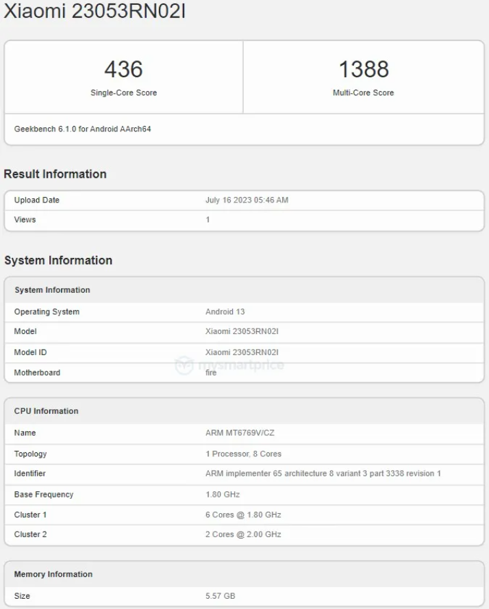 Redmi 12 указан в базе данных Geekbench под номером модели 23053RN02I. В бенчмарке упоминается материнская плата под кодовым названием fire, состоящая из 6 ядер с частотой 1.80 ГГц и 2 ядер с частотой 2 ГГц. Эти характеристики соответствуют однокристальной системе MediaTek Helio G88.