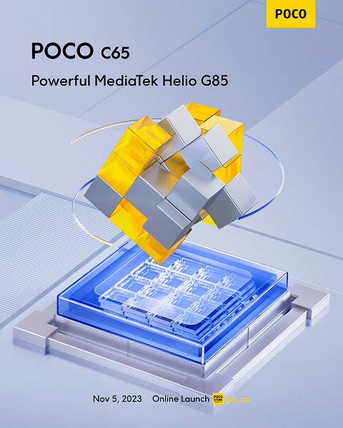 Poco C65 будет официально представлен 5 ноября 2023 года. Он имеет однокристальную систему MediaTek Helio G85, тройную основную камеру с главным 50-Мп датчиком с поддержкой искусственного интеллекта.
