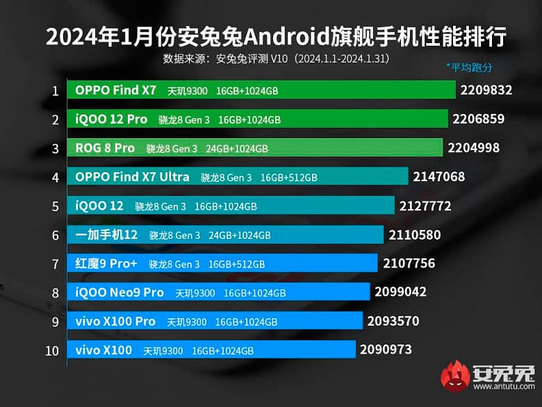 В этот раз лидером оказался Oppo Find X7, который использует чипсет MediaTek Dimensity 9300. Он смог набрать 2 209 832 балла. На втором месте также расположился смартфон этого бренда — iQOO 12 Pro, отставший от лидера всего на 3000 баллов.